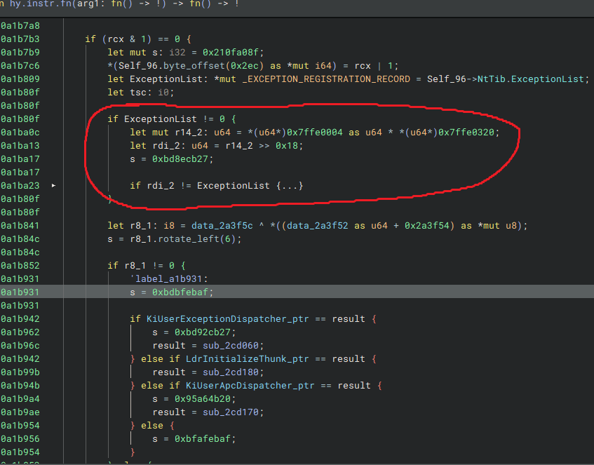 Normally, NtTib->ExceptionList points to the chain of exception handlers registered in the process’s address space. Hyperion, however, does not rely on this list. Instead, it maintains its own internal structure for registered handlers, hardcoding some of them as well. You can see evidence of this inside the KiUserExceptionDispatcher callback. Rather than using the exception list for its traditional purpose, Hyperion repurposes it to store different initialization states, which are then handled by the switch statement mentioned above.